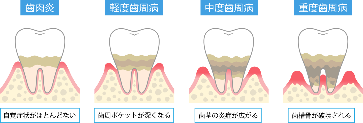 歯周病は、歯ぐきや歯を支える骨などの組織が細菌によって炎症を起こす病気です。進行すると歯がグラグラになり、最終的には抜け落ちてしまうこともあります。また、近年では、歯周病が糖尿病、心疾患、脳血管疾患、認知症など、全身の様々な病気の発症や進行に関わっていることが明らかになってきています。
